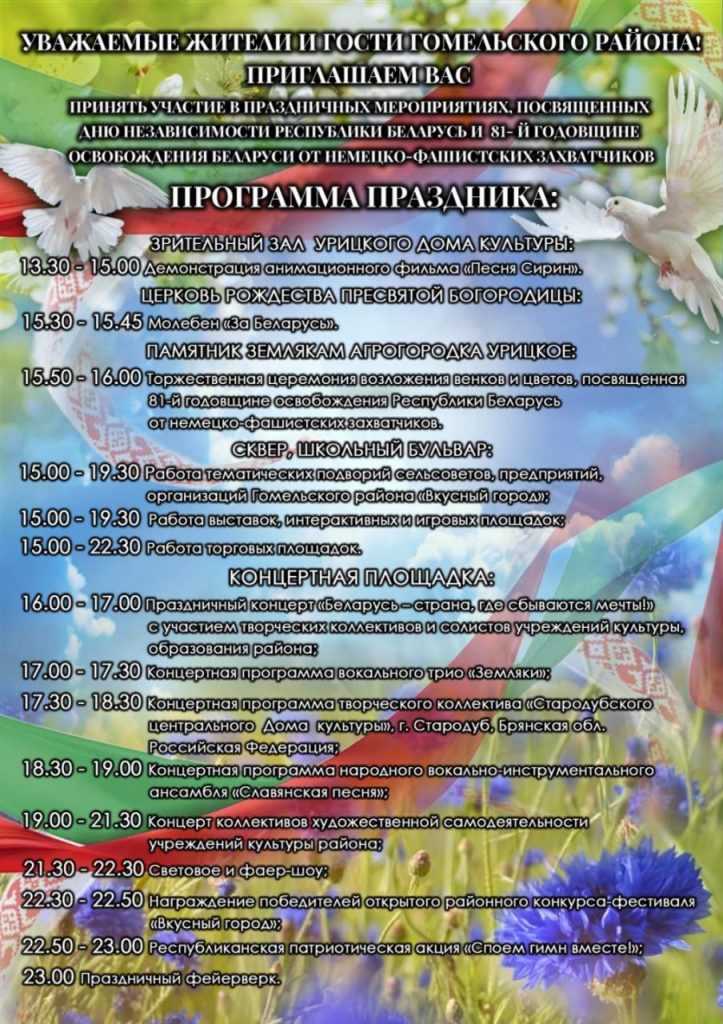 В агрогородке Урицкое 3 июля состоятся мероприятия, посвященные Дню Независимости Республики Беларусь и 81-й годовщине освобождения Беларуси от немецко-фашистских захватчиков.
